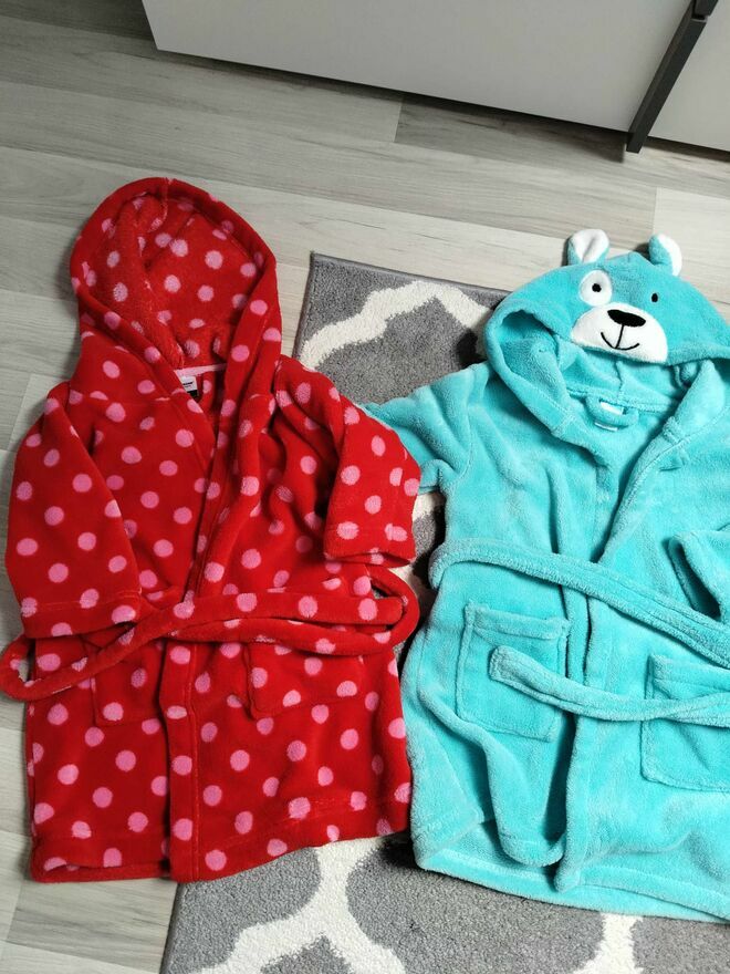Dwa zestawy polarowych szlafroków dla dzieci w dobrym stanie, rozmiar 92/98. Idealne do użytku domowego po kąpieli.Odbior os w Bielsku-Białej, Kalnej, mozliwosc dowolnej wysylki.
